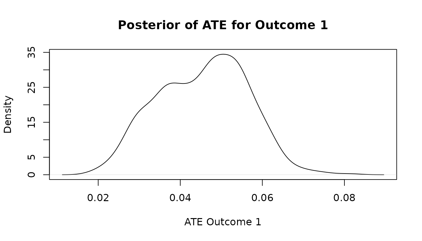 plot(density(ate1_post), xlab="ATE Outcome 1", main="Posterior of ATE for Outcome 1")